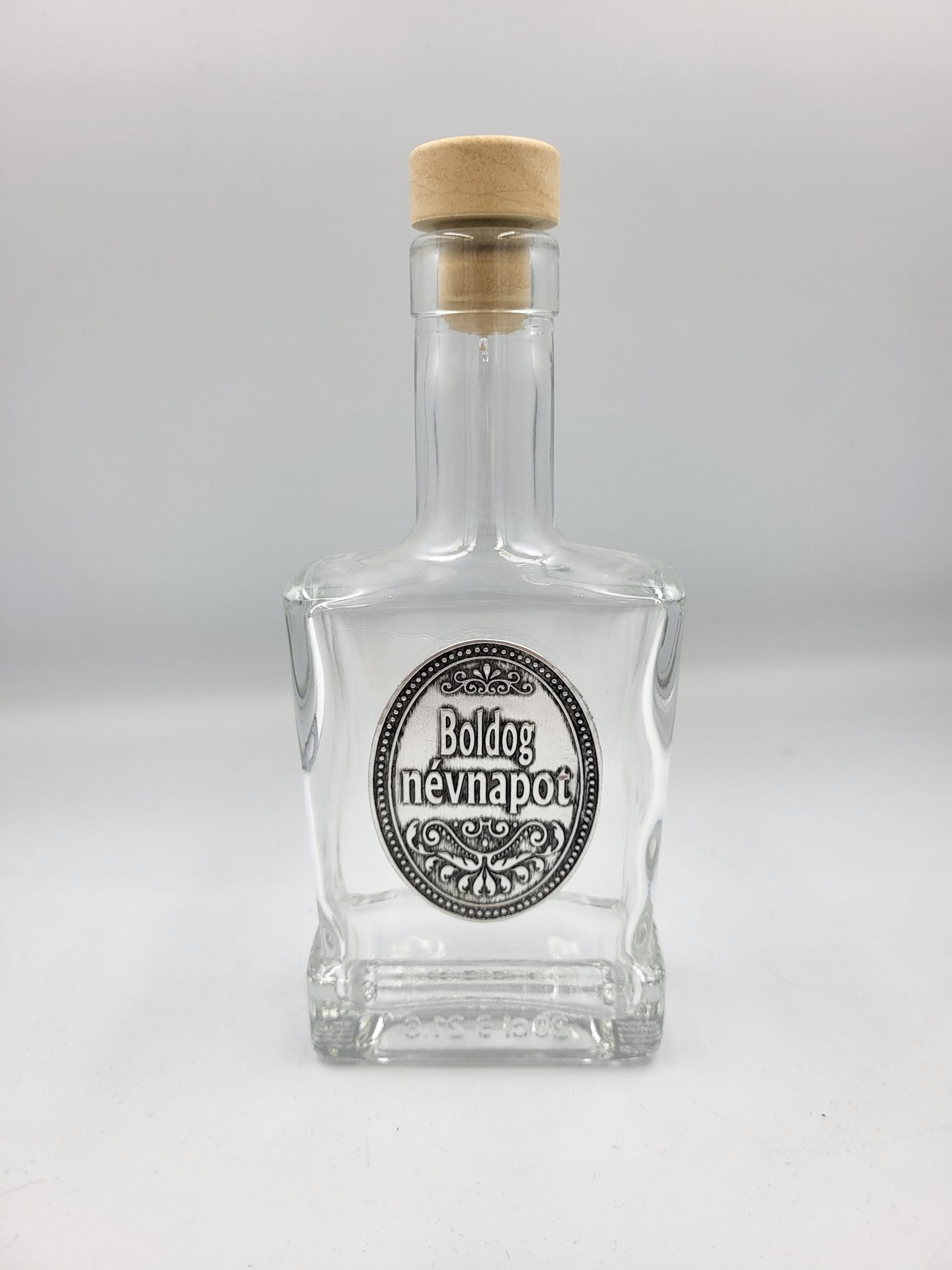 Díszüveg ón címkével, piatta, 2 dl - Boldog NévnapotDíszüveg ón címkével, piatta, 2 dl – Boldog Névnapot